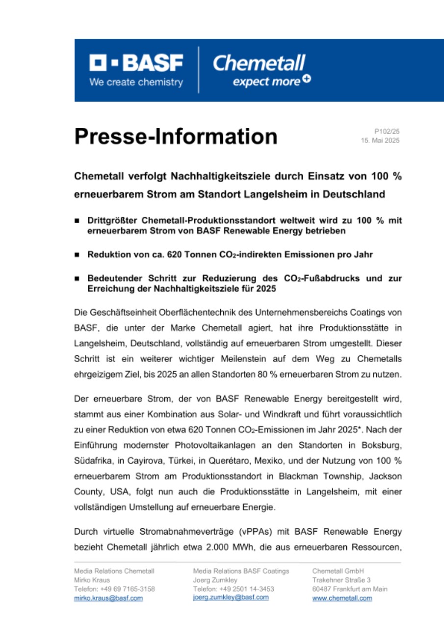 Die Geschäftseinheit Oberflächentechnik des Unternehmensbereichs Coatings von BASF, die unter der Marke Chemetall agiert, hat ihre Produktionsstätte in Langelsheim, Deutschland, vollständig auf erneuerbaren Strom umgestellt. Dieser Schritt ist ein weiterer wichtiger Meilenstein auf dem Weg zu Chemetalls ehrgeizigem Ziel, bis 2025 an allen Standorten 80 % erneuerbaren Strom zu nutzen.