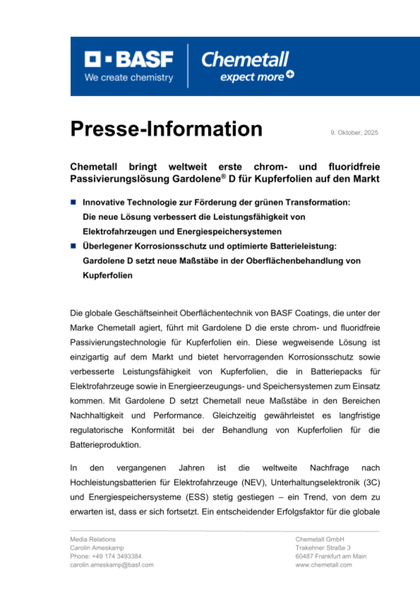 Die globale Geschäftseinheit Oberflächentechnik von BASF Coatings, die unter der Marke Chemetall agiert, führt mit Gardolene D die erste chrom- und fluoridfreie Passivierungstechnologie für Kupferfolien ein. Diese wegweisende Lösung ist einzigartig auf dem Markt und bietet hervorragenden Korrosionsschutz sowie verbesserte Leistungsfähigkeit von Kupferfolien, die in Batteriepacks für Elektrofahrzeuge sowie in Energieerzeugungs- und Speichersystemen zum Einsatz kommen. Mit Gardolene D setzt Chemetall neue Maßstäbe in den Bereichen Nachhaltigkeit und Performance. Gleichzeitig gewährleistet es langfristige regulatorische Konformität bei der Behandlung von Kupferfolien für die Batterieproduktion.