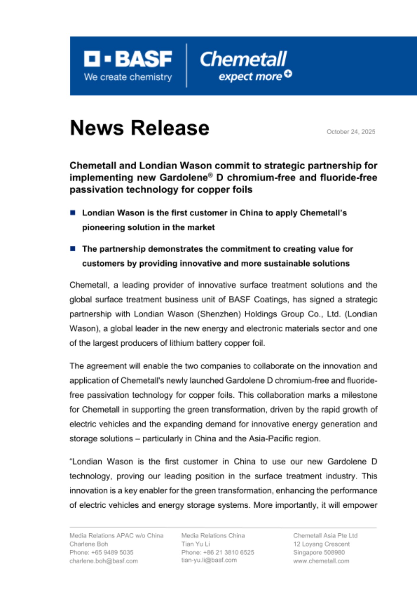 Chemetall, a leading provider of innovative surface treatment solutions and the global surface treatment business unit of BASF Coatings, has signed a strategic partnership with Londian Wason (Shenzhen) Holdings Group Co., Ltd. (Londian Wason), a global leader in the new energy and electronic materials sector and one of the largest producers of lithium battery copper foil.