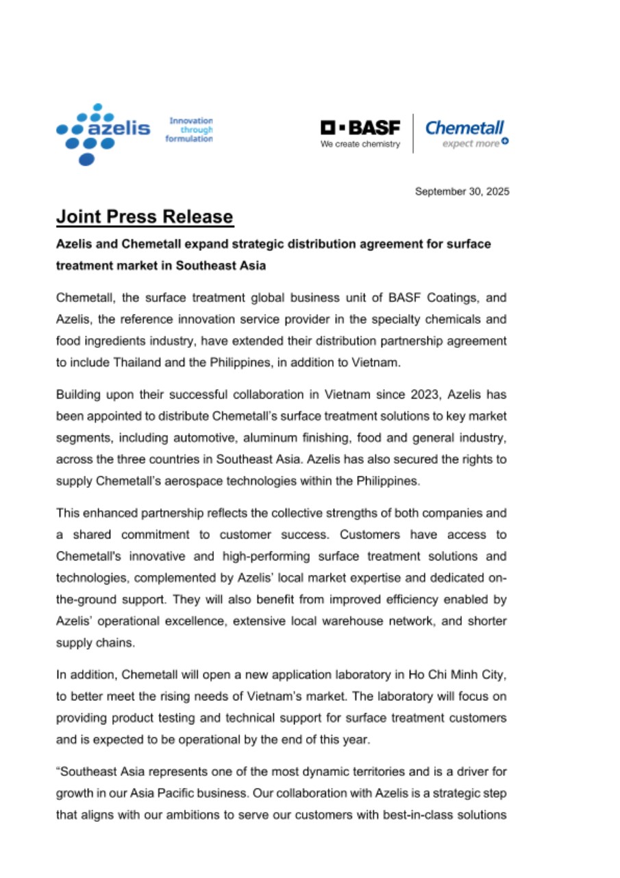 “We are proud to strengthen our partnership with Chemetall and expand our collaboration across Southeast Asia. Our success in Vietnam since 2023, built on technical expertise, market knowledge, and close customer relationships, has set a strong foundation for this next chapter. With our agile, localized approach and streamlined distribution model, we’re committed to delivering tailored support and driving growth together across the region,” adds Benoit Fritz, Azelis Asia Pacific CEO.