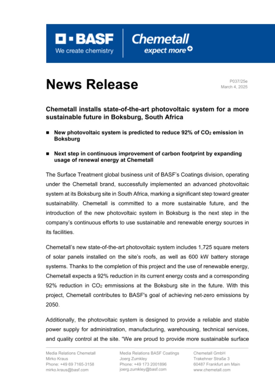 Additionally, the photovoltaic system is designed to provide a reliable and stable power supply for administration, manufacturing, warehousing, technical services, and quality control at the site. “We are proud to provide more sustainable surface treatment solutions that support our customers in achieving their sustainability goals. Sustainability is a corporate responsibility, and we are committed to implementing more sustainable processes and using renewable energy sources in our facilities worldwide. Our advanced photovoltaic system in Boksburg is another step toward improving our carbon footprint while increasing our operational autonomy and reliability in South Africa," says Frank Naber, Senior Vice President of Chemetall.