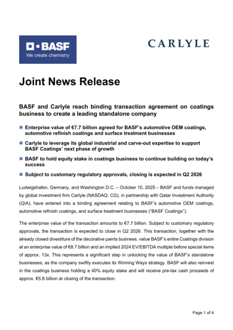 Ludwigshafen, Germany, and Washington D.C. – October 10, 2025 – BASF and funds managed by global investment firm Carlyle (NASDAQ: CG), in partnership with Qatar Investment Authority (QIA), have entered into a binding agreement relating to BASF’s automotive OEM coatings, automotive refinish coatings, and surface treatment businesses (“BASF Coatings”).
