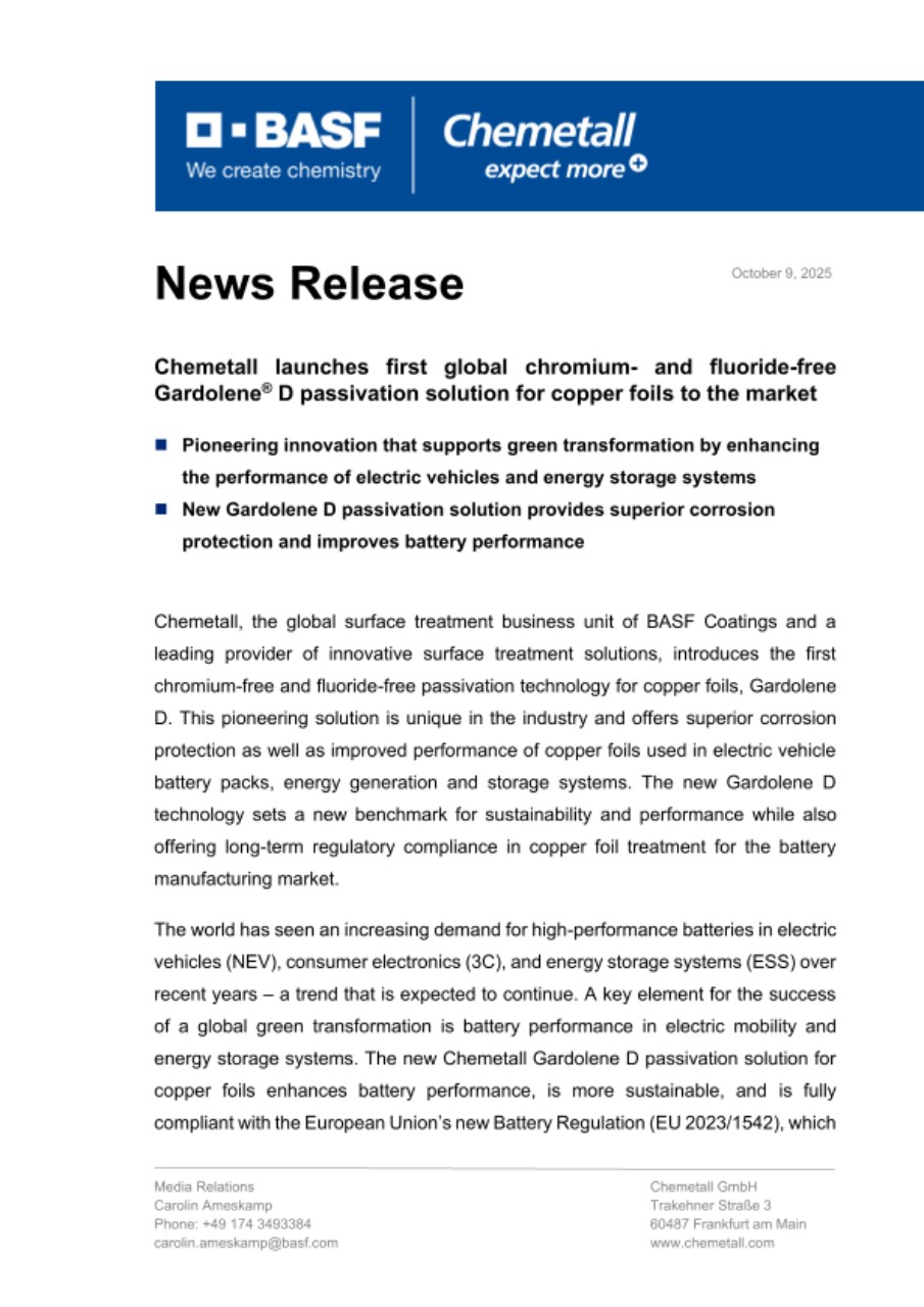 “The green transformation, with continuously rising electric vehicle numbers and an increasing market for new concepts in energy generation and storage systems, needs new, innovative surface treatment solutions. At Chemetall, we are committed to solving our customers' challenges and supporting their business with our expertise. The new Gardolene D passivation solution for copper foil ushers in a new era for copper foil passivation, with increased battery performance, greater sustainability, and future-proof customer processes. It is another great example of what our claim ‘expect more’ means for us: providing innovative solutions in the metal-using industry that offer added value to customers,” says Frank Naber, Senior Vice President Global Surface Treatment at BASF Coatings.